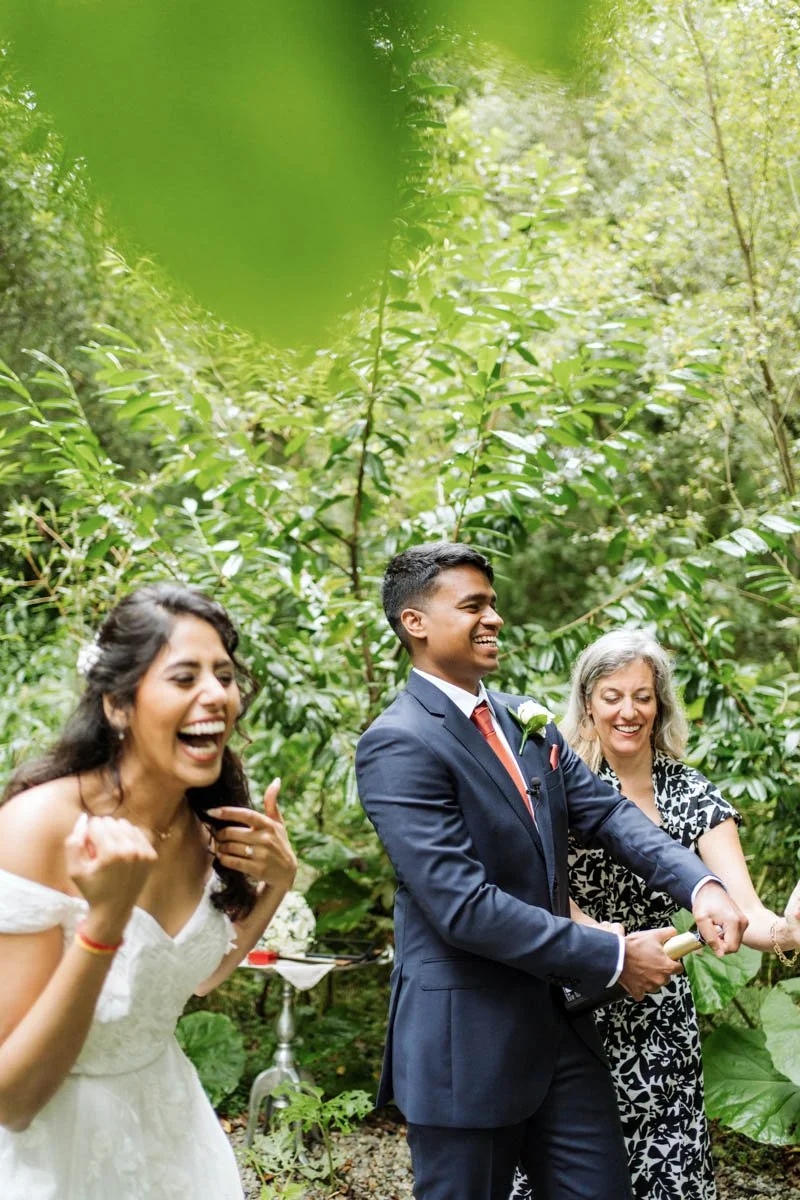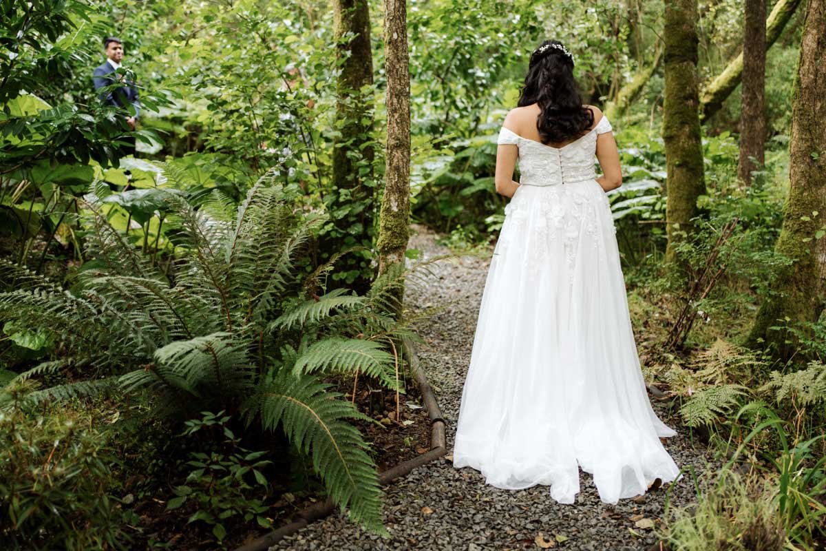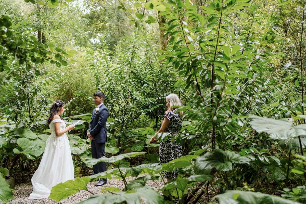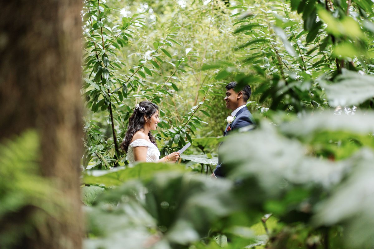 The walk through the woods became their aisle — a path leading into a clearing surrounded by lush trees and soft greenery. As they stood together personal vows were exchanged — a perfect mix of gentle humour and heartfelt emotion.